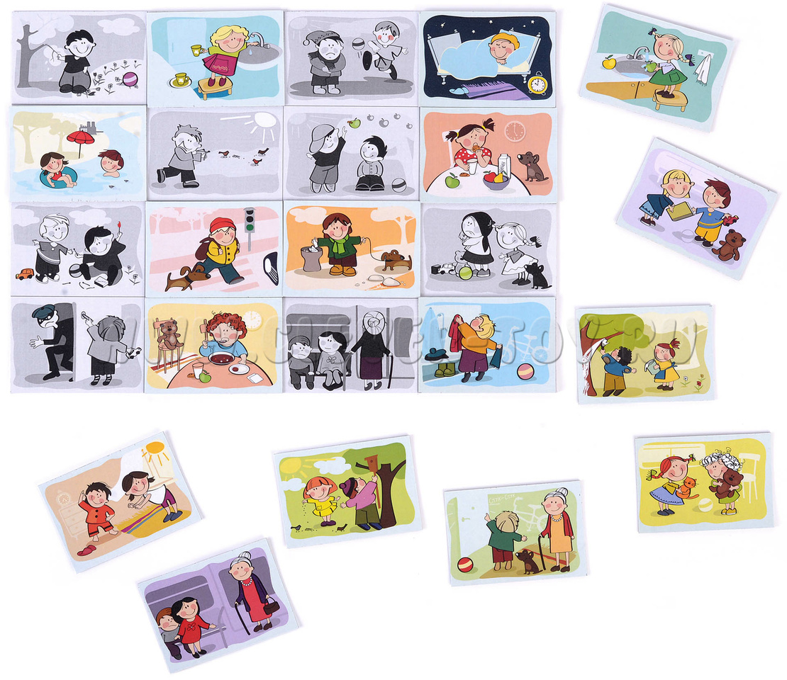 Задача - найти противоположные по значению пары, исходя из принципа: "это - плохо, а это - хорошо". Одной черно-белой картинке на поле должна соответствовать одна цветная картинка на карточке. Положите цветную карточку на черно-белую картинку так, чтобы она примагнитилась.