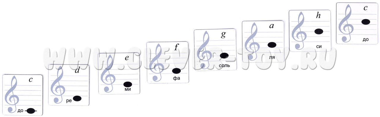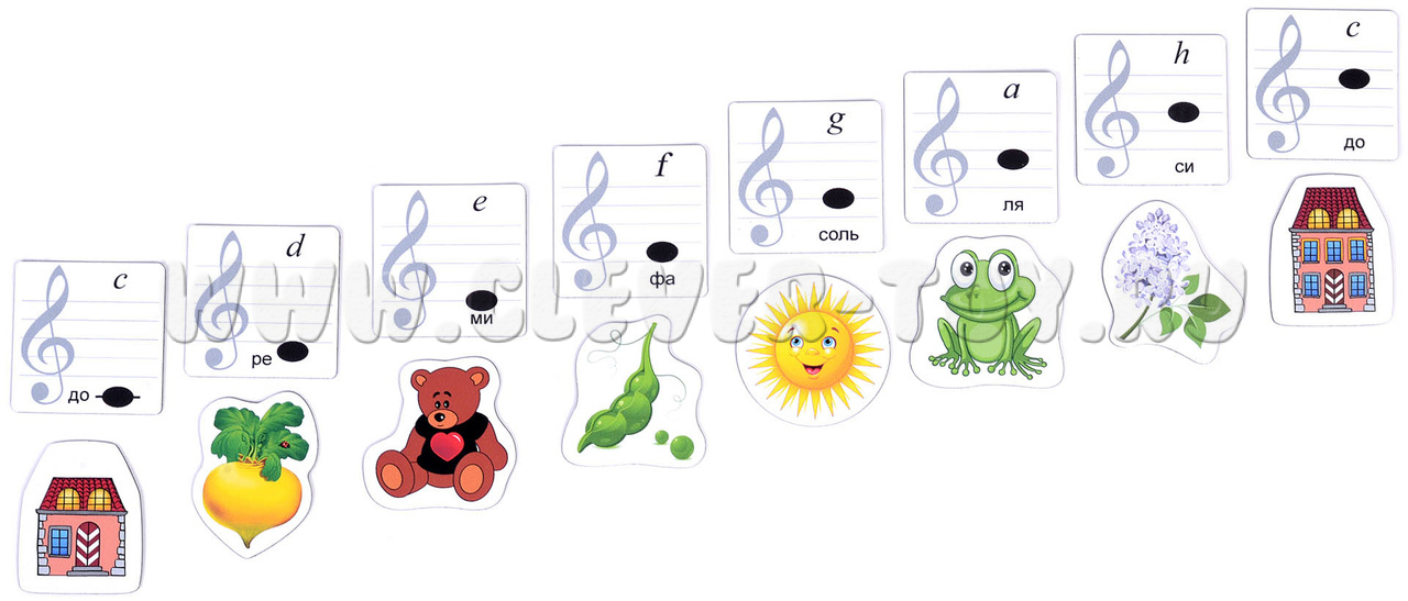 Набор магнитных карточек для обучения музыкальной грамоте. На них - местоположение нот фортепианной гаммы и ассоциативные картинки.