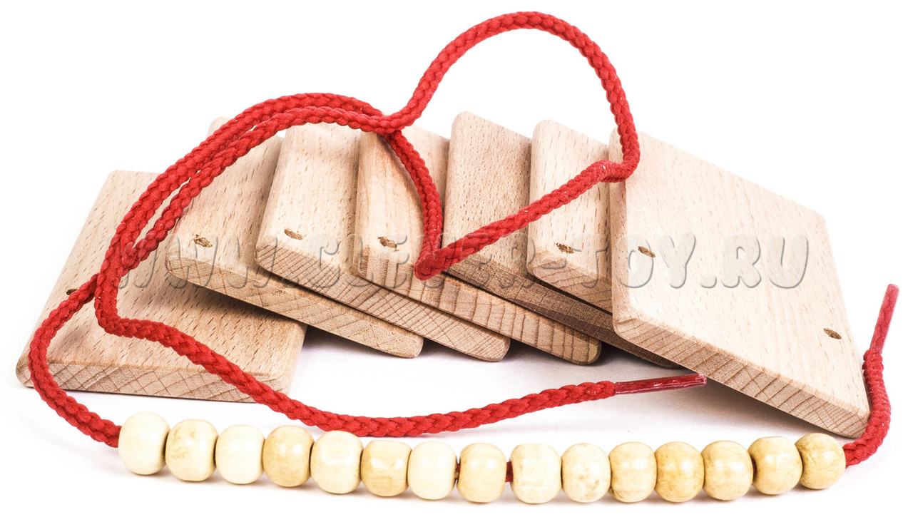 • Пластичная трещотка- сувенирная, состоит из 7 пластин, которые скреплены между собой через деревянные бусинки шнуром.