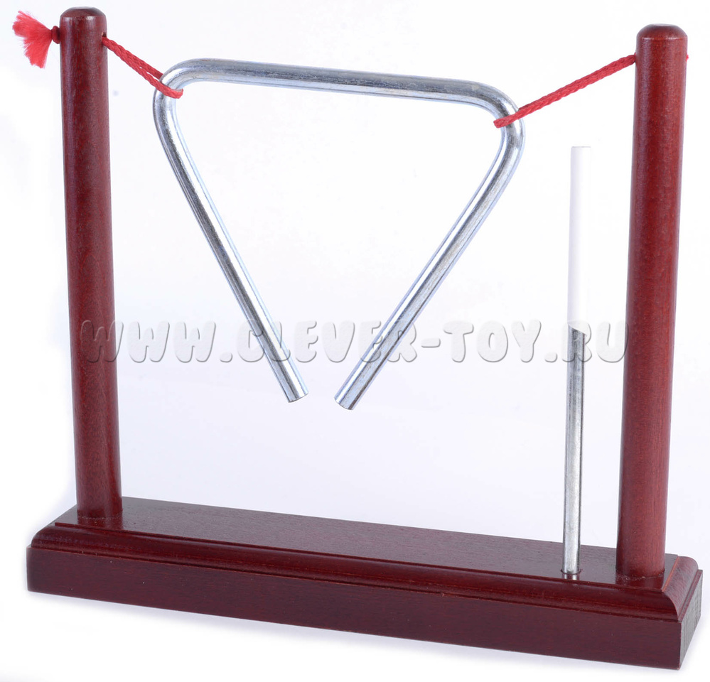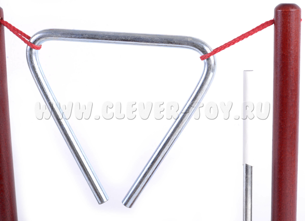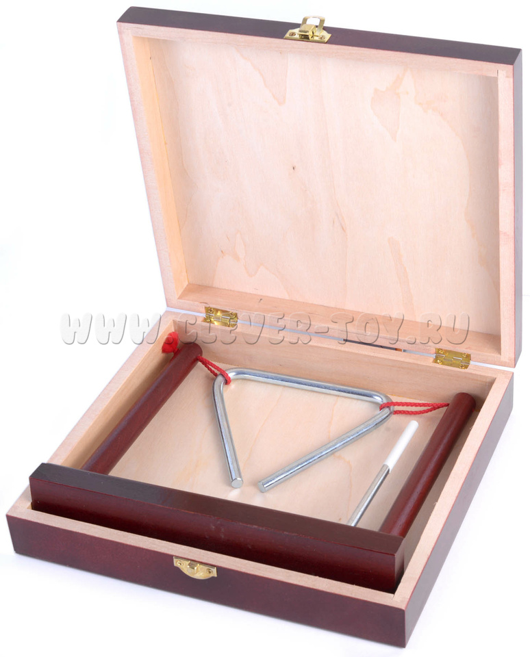 Треугольник выполнен из стали диаметром 8мм, длина стороны - 12см. Гальваническое покрытие не ухудшает качество звука и не разрушается при механическом воздействии. Треугольник закреплен на деревянном основании. Ударная палочка из нержавеющей стали. Подарочный кейс с золочеными застежками.