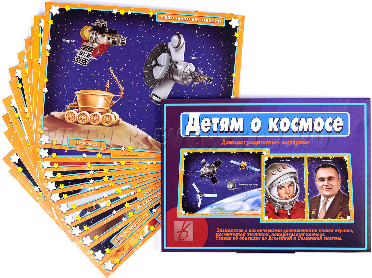 Демонстрационный материал "Детям о космосе" адресован родителям, воспитателям и методистам детских садов и дошкольных образовательных учреждений и нацелен на формирование у детей первичных представлений о Космосе и Вселенной, личностях и достижениях выдающихся космонавтов и конструкторов, знаковых событиях Российской космонавтики в процессе ее становления и развития.