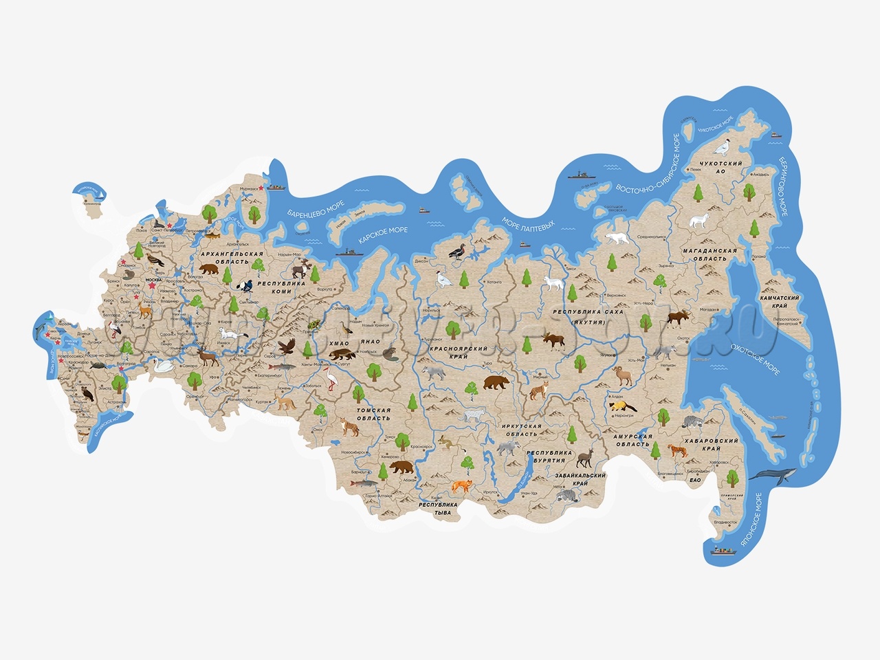 На карте указаны субъекты РФ: области, округа, края и республики с их столицами. Рисунками отображены редкие и охраняемые животные, птицы и рыбы, которые обитают в разных регионах России. Тактильными элементами карты являются деревья, а также звезды, центр которых подсвечивается с помощью маленьких светодиодов. Звездами отмечены города-герои - звания, которые присвоены городам, прославившимся своей героической обороной во время Великой Отечественной войны 1941-1945 годов.