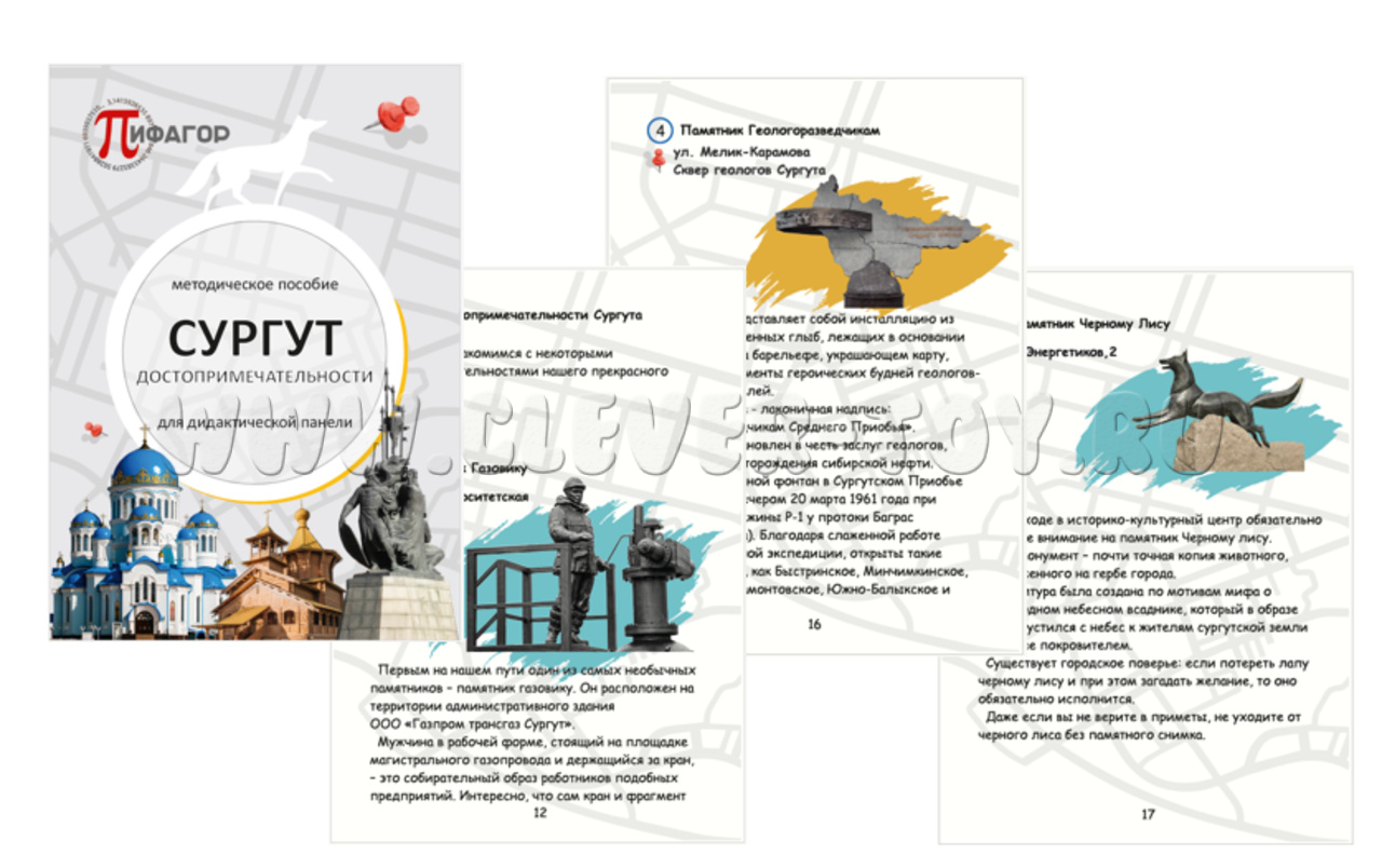 - Методическое пособие формата А5 - рекомендации для педагога по проведению занятий, посвящённых истории и достопримечательностям Сургута.