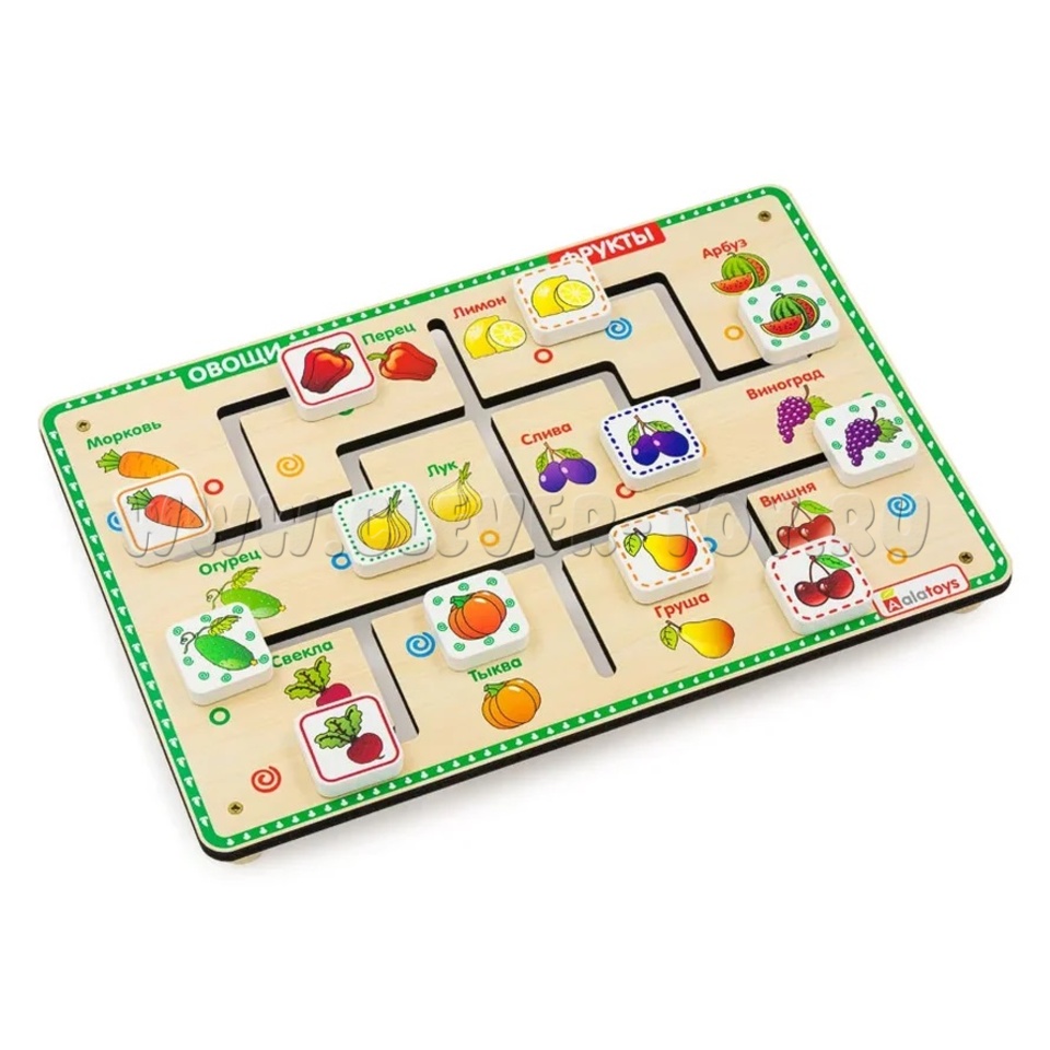 Фишки с рисунками двигаются по пазам на доске с изображением фруктов и овощей. Каждая фишка-картинка должна оказаться рядом с соответствующим рисунком.