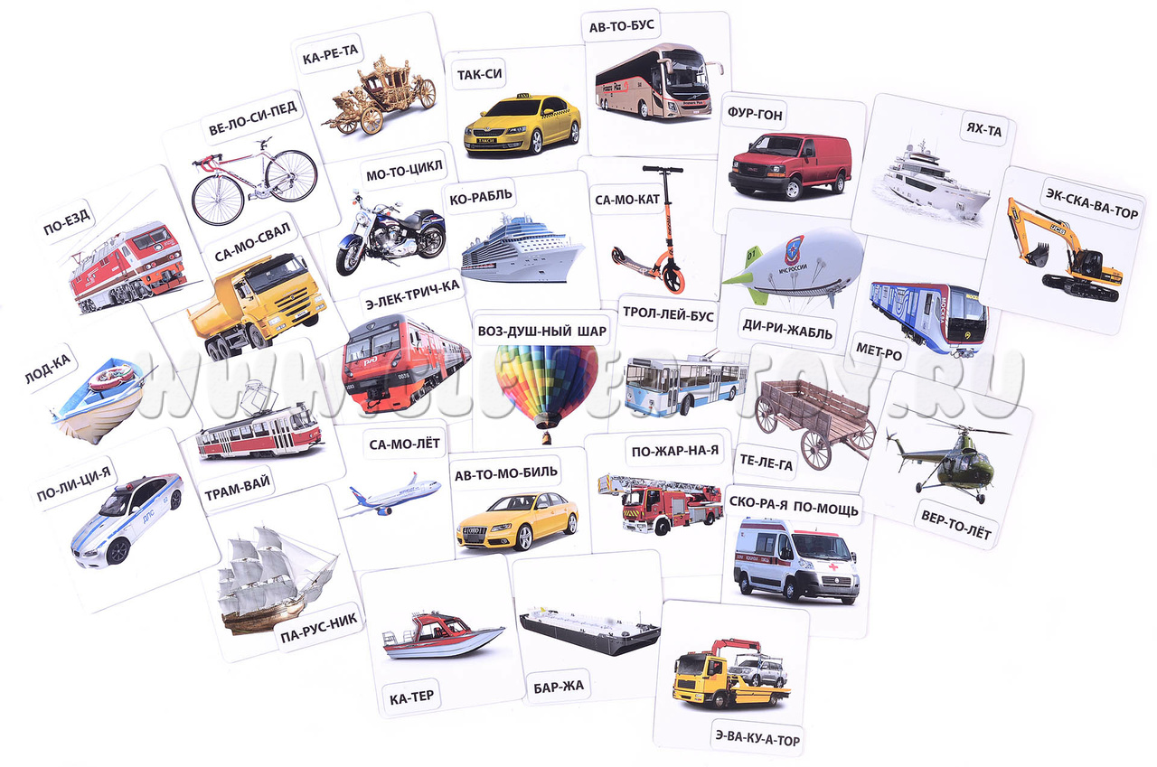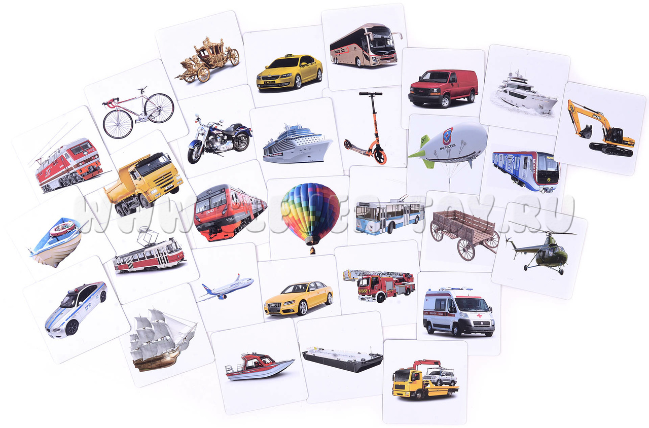 В набор входят 30 карточек с изображениями транспортных средств, каждая из которых имеет размеры 9,5 см х 9,5 см, и 30 карточек с названиями.