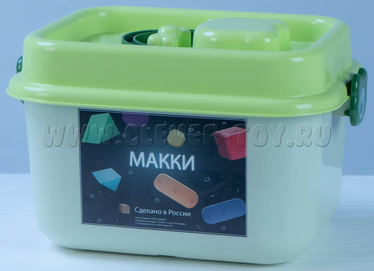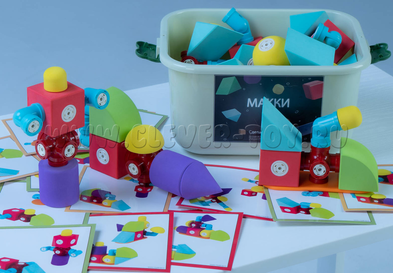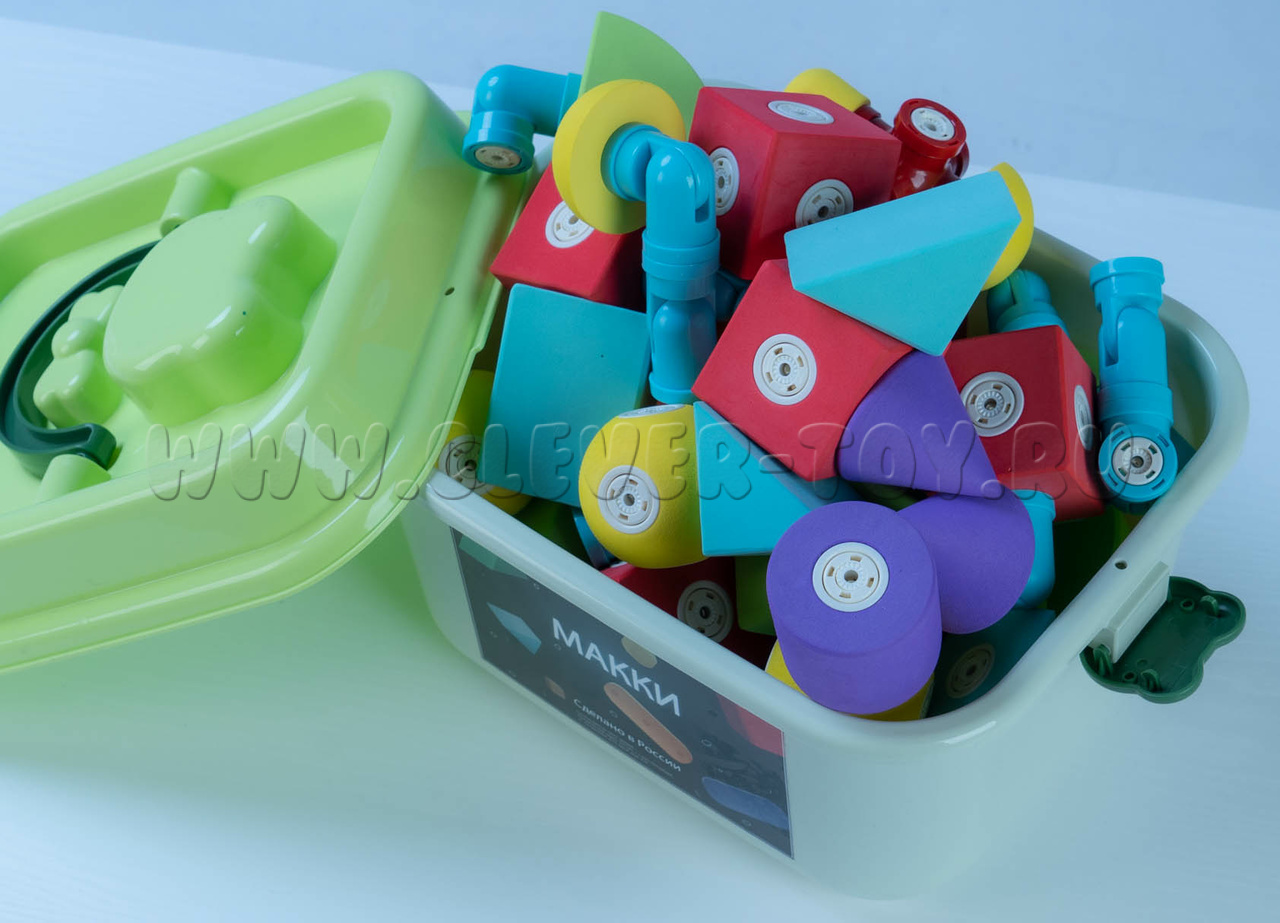Конструктор "МАККИ 60" - набор цветных магнитных деталей, крупных геометрических фигур с магнитными креплениями. Детали конструктора окрашены в приятные однотонные цвета, со звуковым эффектом погремушки.