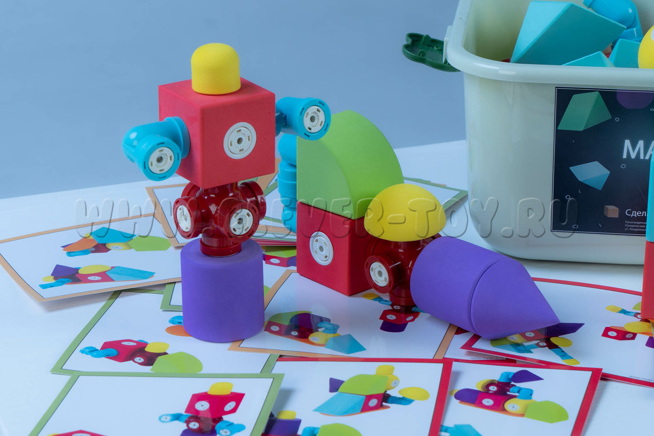 Каждая из деталей имеет от 1 до 9 вариантов магнитной стыковки, что практически не ограничивает ребенка в конструировании. Простые детали отлично подходят для детей младшей группы ДОУ, детей с ОВЗ и РАС. Более сложные по форме и креплениям детали предназначены для детей средней и старшей группы.