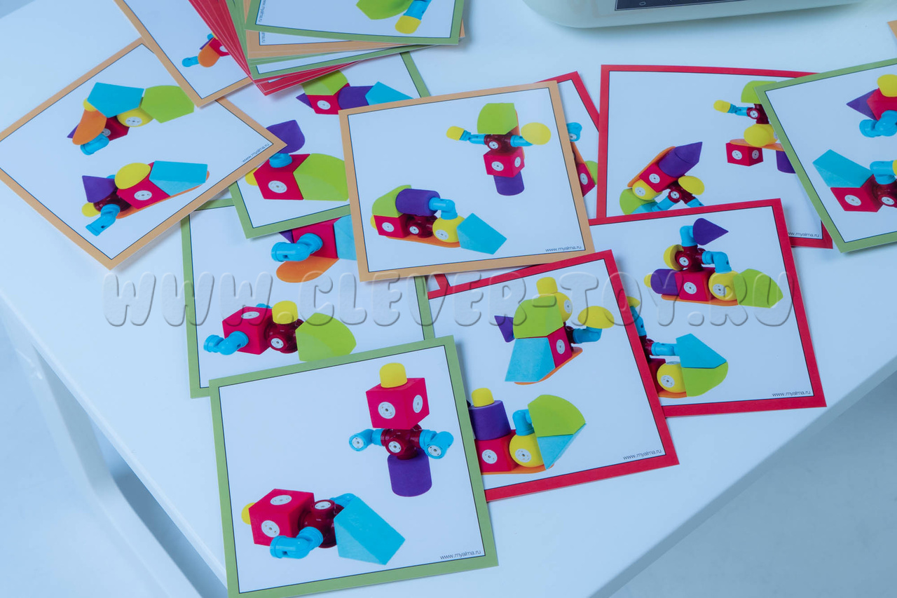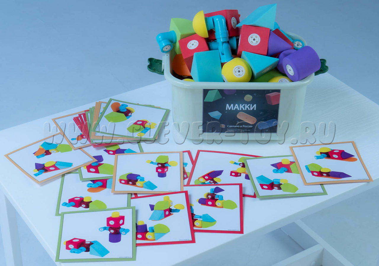 Один комплект "МАККИ 60" рассчитан на совместную работу до пяти детей. Разработанные карточки с заданиями разделены на три уровня сложности, выполнение заданий сопровождается упражнениями из методического пособия.