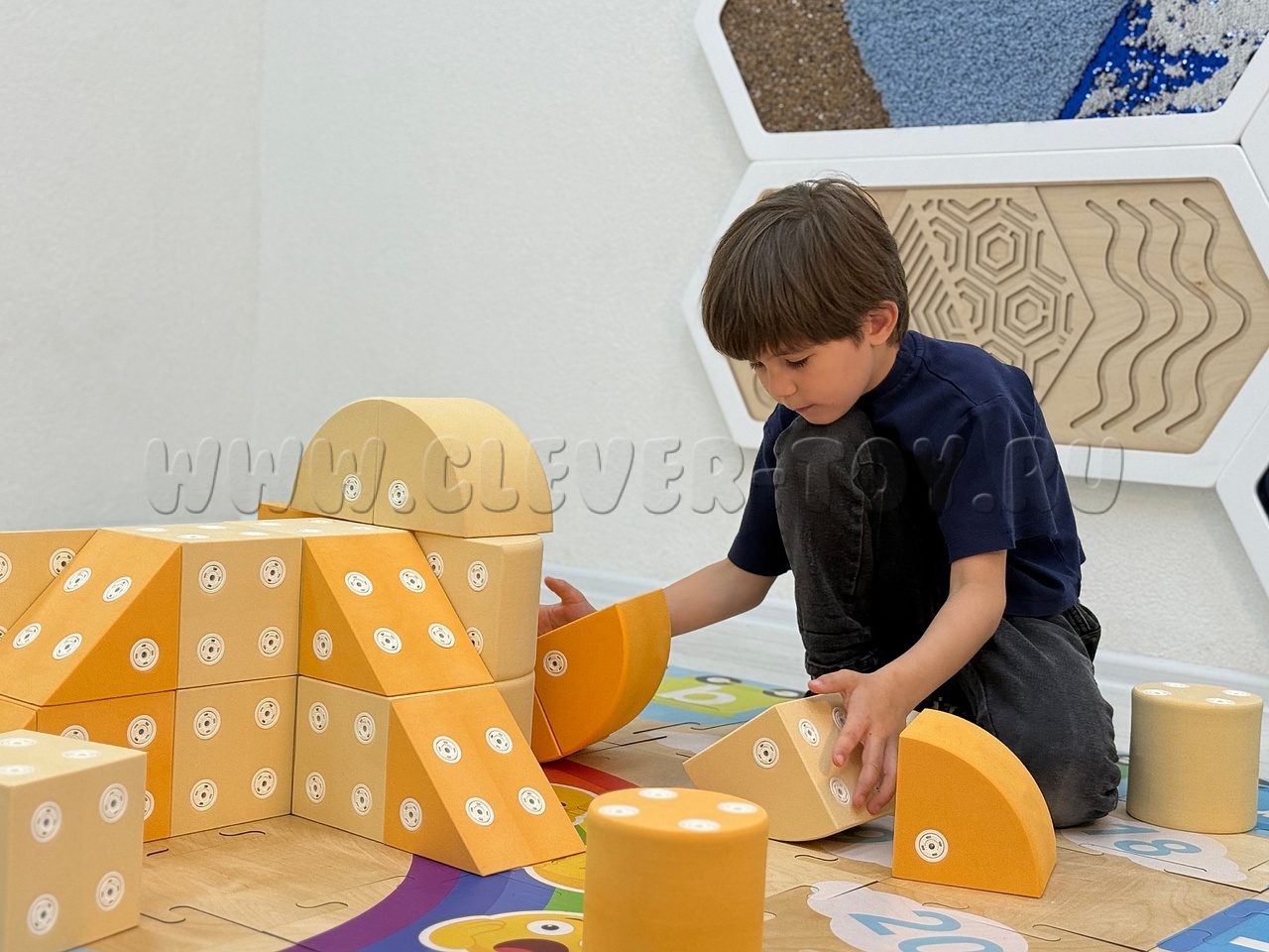 Напольный конструктор выполнен в двух цветах.Крупные детали в виде геометрических фигур выполнены из мягкого гипоаллергенного материала. Крепления имеет магнитную систему для быстрой и простой стыковки-расстыковки деталей. У каждой детали есть от 4 до 24 вариантов магнитной стыковки, что дает полную свободу для творчества.
