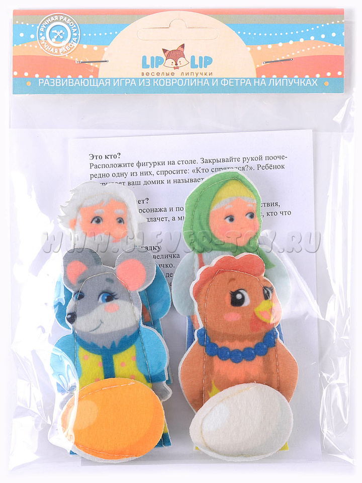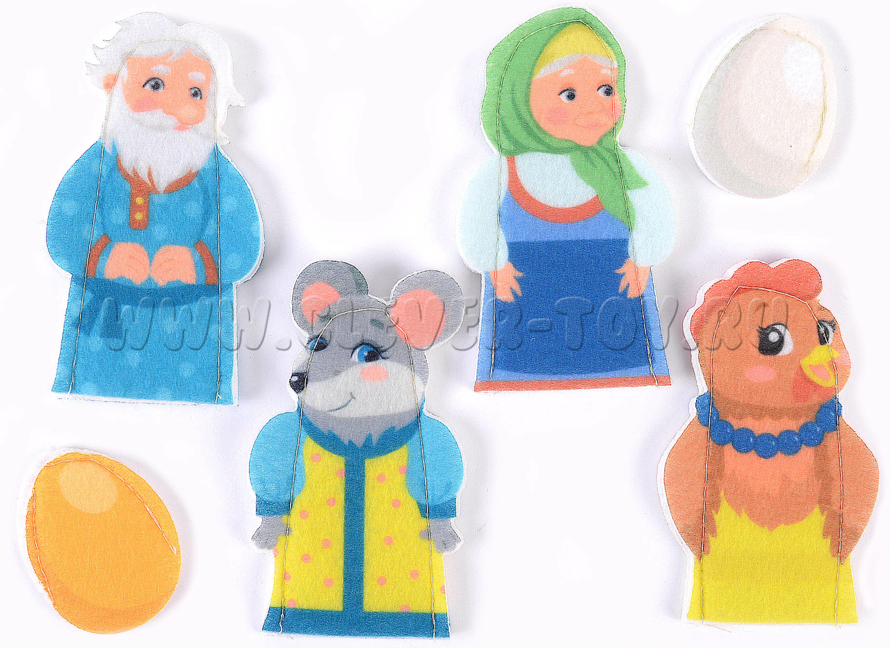 В комплект пособия входят пальчиковые куклы: курочка Ряба, дедушка, бабушка, мышка и два яйца – золотое и простое (6 шт.).