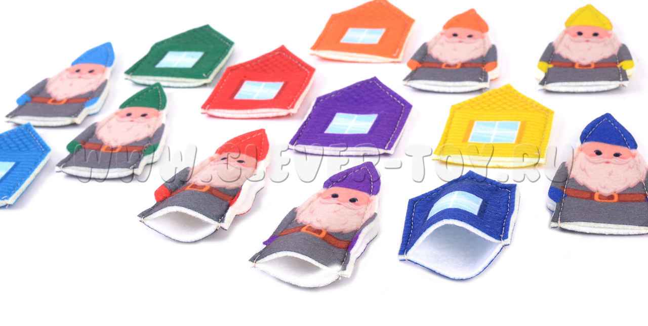 Набор включает 14 элементов из фетра: 7 гномиков и 7 домиков.