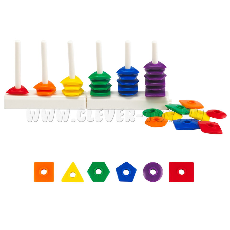 - 36 деталей (в 6 цветах) в форме 6 геометрических фигур: треугольник, круг, прямоугольник, квадрат, пятиугольник, шестиугольник; каждая деталь по центру имеет отверстие для нанизывания;