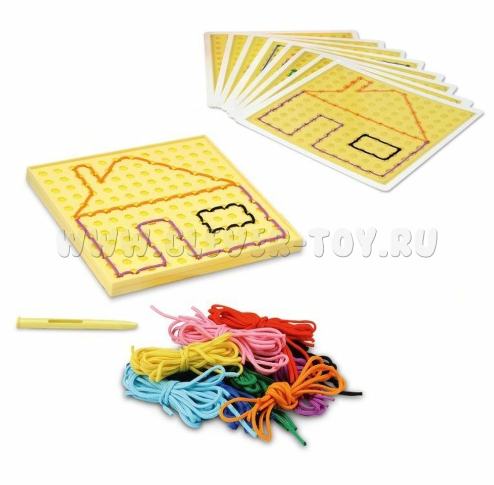 - 8 двусторонних карточек с шаблонами, с помощью которых дети смогу вышивать знакомые предметы, в том числе бабочки, автомобили, домашние животные и многое другое.