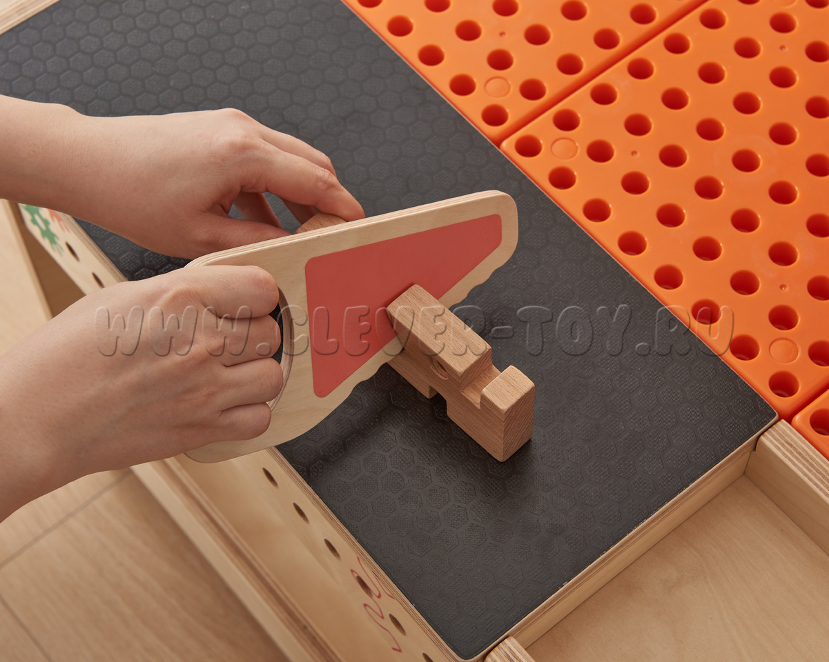 • Верстак (спереди) имеет отверстия для крепления различных деталей (шестеренки, винты Masterkidz)
