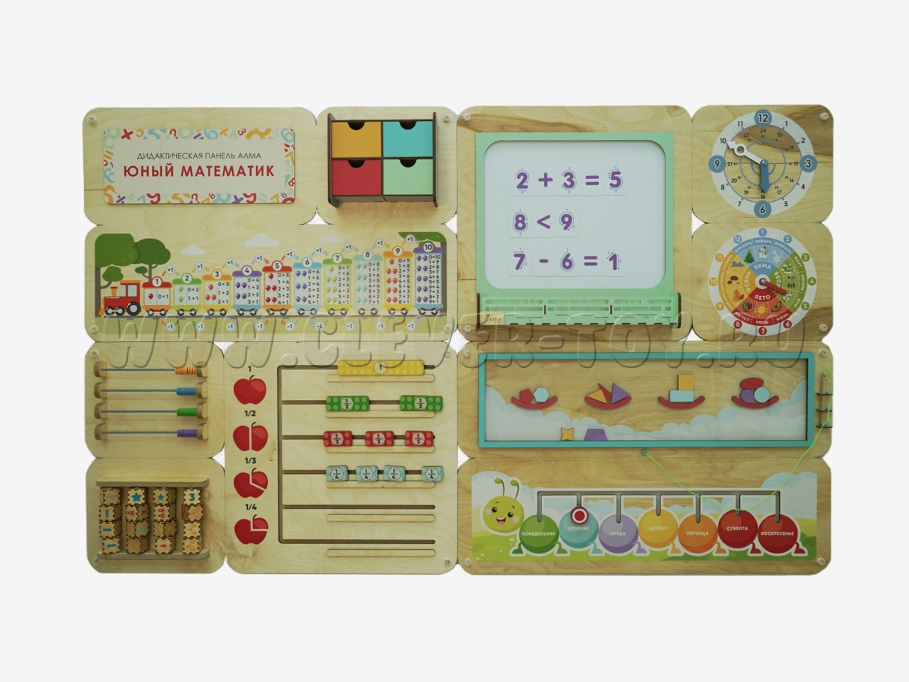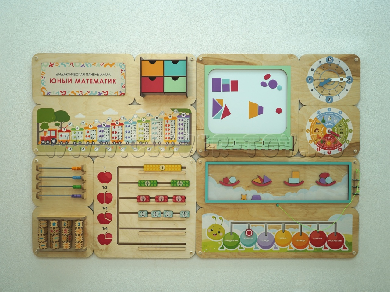 Дидактическая панель "Юный математик" создан для развивающей предметно-пространственной среды, формирования интереса к математике, познавательного развития детей, а также для оформления стен детского сада.